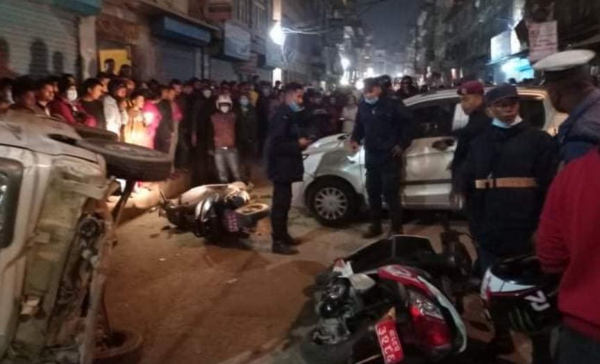 स्थानीय प्रेम महर्जनका अनुसार ३ वटा सवारीलाई ठक्कर दिएर सो गाडी अनियन्त्रित भइ पल्टिएको हो । घटनाको विस्तृत विवरण आउन बाँकी छ ।