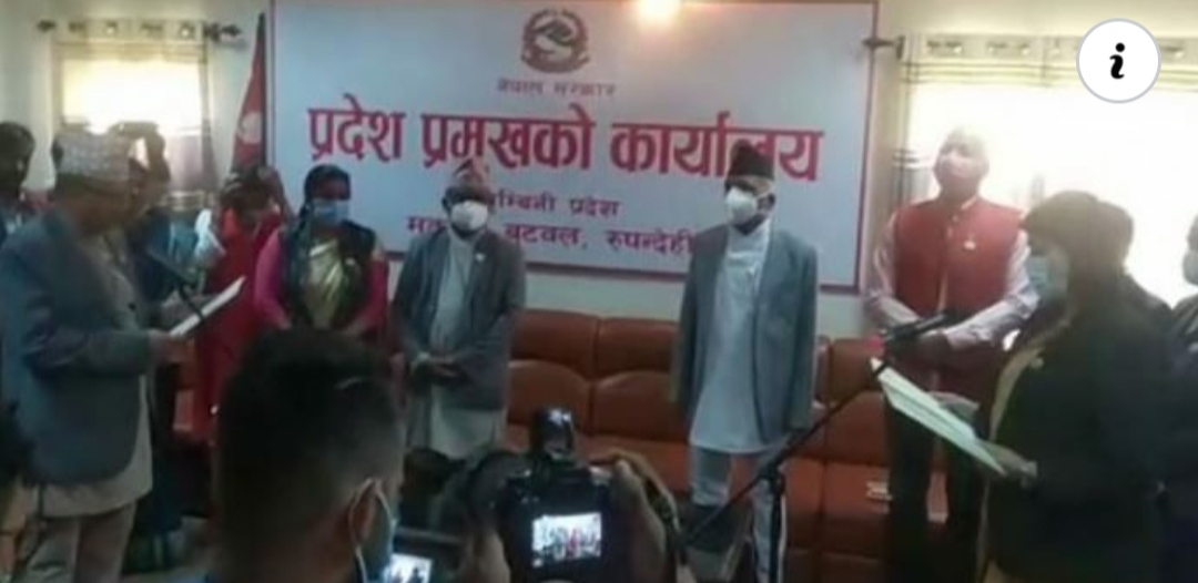 प्रदेश प्रमुख धर्मनाथ यादवले नवनियुक्त मन्त्रीहरूलाई सपथ गराएका छन् ।