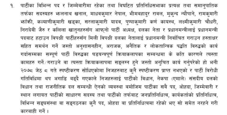 बैठकले झलनाथ खनाल, माधव नेपाल,भीम रावल, मुकुन्द न्यौपाने, रामकुमारी झाँक्री, कल्याणी खड्का, सरला यादव, पुष्पा कर्ण, लक्ष्मी चौधरी, कलिला खातुन र निरा देवी जैरूलाई साधारण सदस्य नरहनेगरी निष्कासन गरेको हो।