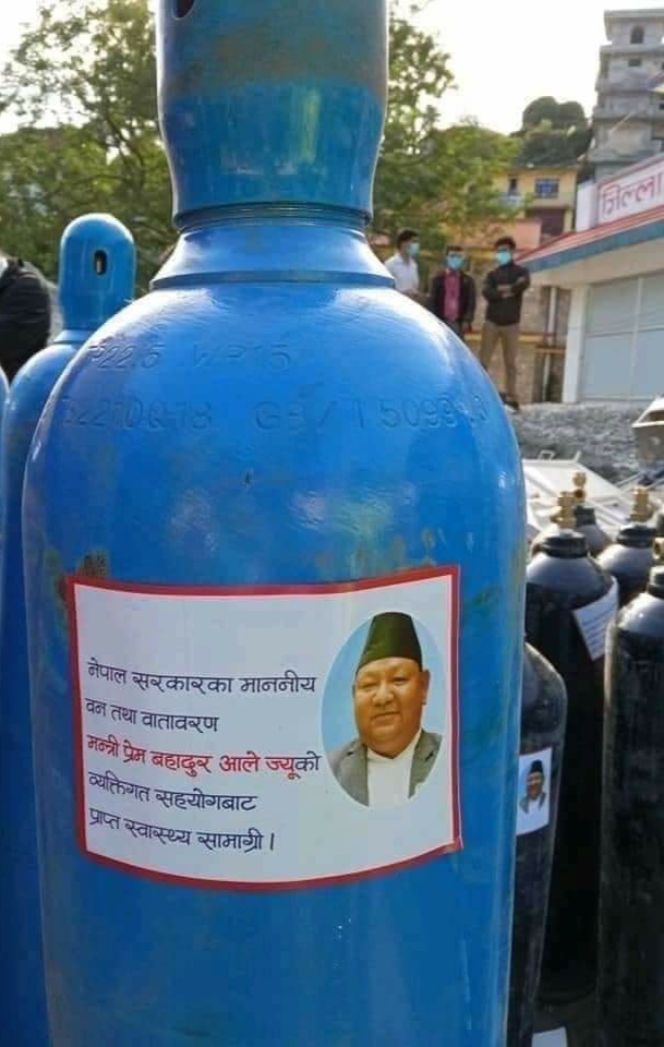काठमाडौं। वन तथा वातावरण मन्त्री प्रेम आलेले आफ्नै खर्चमा गृहजिल्ला डोटीमा मेडिकल सामग्री पुर्याएका छन् । आलेले गृहजिल्लाका अस्पतालमा कोरोना सङ्क्रमितको उपचारमा प्रयोग हुने औषधि, ७५ थान भरिएका अक्सिजन सिलिण्डर, सर्जिकल मास्क एक लाख ५० हजार, तीन थान अक्सिजन उत्पादन गर्ने कन्सट्रेटर , ३० एचडियु श्यया, एन्टिजेन किट, रेम्डिसिभिर, स्यानिटाइजरलगायत स्वास्थ्य सामाग्रीहरु पुर्याएका छन् । केही नियमित सरकारी प्रक्रियाबाट प्राप्त हुने सामग्रीका अतिरिक्त ७५ थान भरिएका अक्सिजन सिलिण्डर, एक लाख ५० हजार सर्जिकल मास्क, एन्टिजेन किट, रेम्डेसिभिर, स्यानिटाइजर मन्त्री आलेले आफ्नो लगानीमा किनेर दिएको उनका सचिवालयका कर्मचारीको दाबी छ । आलेले डोटी पुर्याएका सिलिन्डरदेखि औषधीका प्याकेटसम्ममा आफ्नो तस्विर टाँसेका छन् ।ती मध्ये केही अक्सिजनका सिलिन्डरमा समेत आलेको तस्विर छ । उक्त सिलिन्डर केहीदिन अघि चिनियाँ सरकारले नेपाललाई अनुदानमा दिएको थियो । गत, वैशाखमा चीन सरकारले नेपाललाई २० हजार सिलिन्डर अक्सिजन दिने घोषणा गरेको थियो । घोषणा अनुसार वैशाख २१ मा २ हजार अक्सिजनको खाली सिलिन्डर नेपाल आएको थियो ।