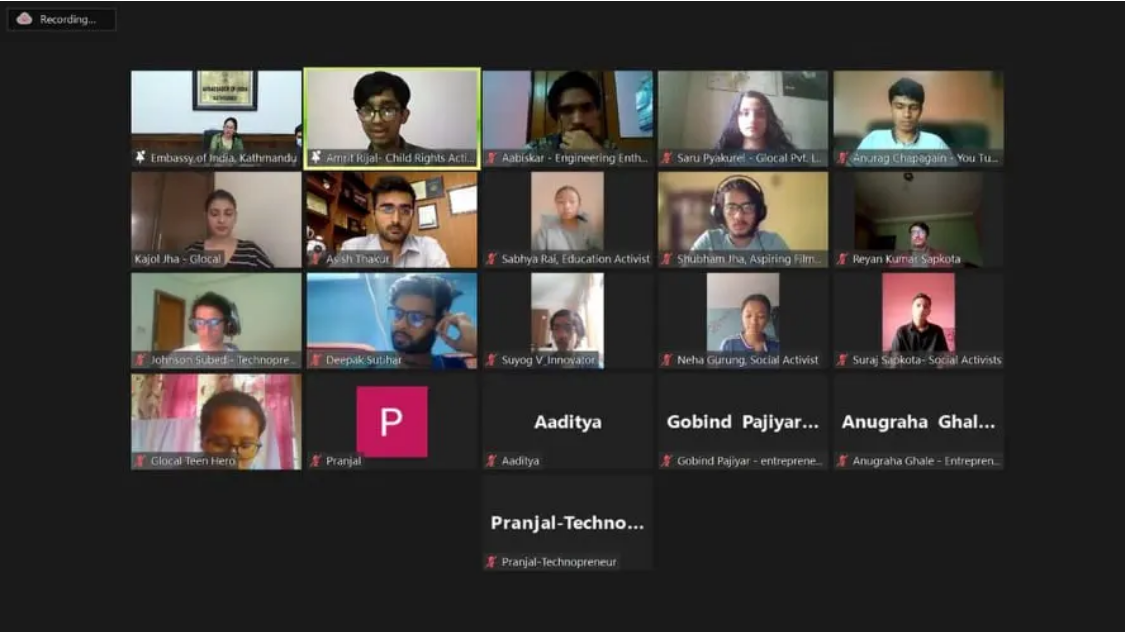 काठमाडौं । भारतीय राजदूतावास र एम/एस ग्लोबल प्राइभेट लिमिटेडले दूतावासका नियोग उप–प्रमुख नामग्य खम्पा र दूतावासको सहयोगमा सञ्चालित ‘ग्लोबल टीन हीरो’ कार्यक्रमका अन्तिम २० जना प्रतियोगीबीच भर्चुअल अन्तरक्रिया गरेको छ । नेपालका विभिन्न जिल्लाबाट आएका १४ देखि २० वर्ष उमेर समूहका अन्तिम २० प्रतियोगीहरुले उत्सुकता एवम् चासोका साथ नियोग उप–प्रमुख खम्पासँग अन्तरक्रिया गरेका छन् । २० सहभागीहरुमा सामाजिक उद्यमी, अभियन्ता, शिक्षक लगायत नवीन सोच भएका व्यक्तिहरु रहेका थिए ।