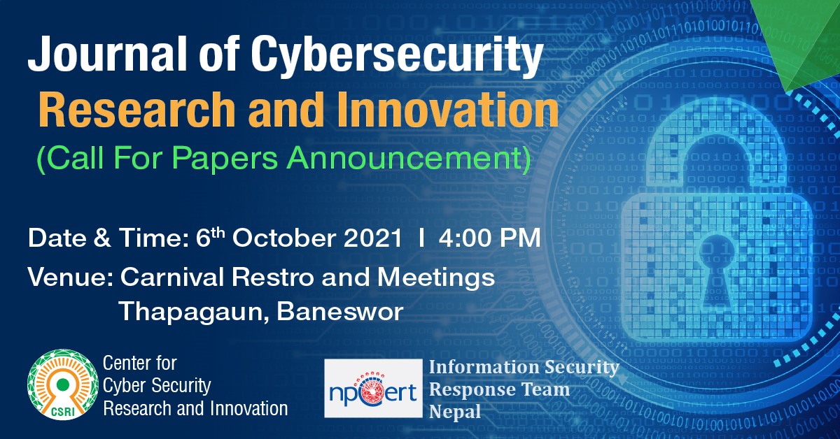 साइबर सेकुरिटी रिसर्च एण्ड इनोभेसन नेपाल र एनपीसर्ट को संयुक्त आयोजनामा साइबर सेकुरिटी रिसर्च एण्ड इनोभेसन नेपालले प्रकाशन गर्न लागेको नेपाल कै प्रथम साइबर सेकुरिटी जर्नलको समुद्घाटन तथा जर्नलका लागि साइबर सेकुरिटी क्षेत्रका बिज्ञहरु बाट लेख रचना को लागि खुल्ला आब्हान गरियको छ |