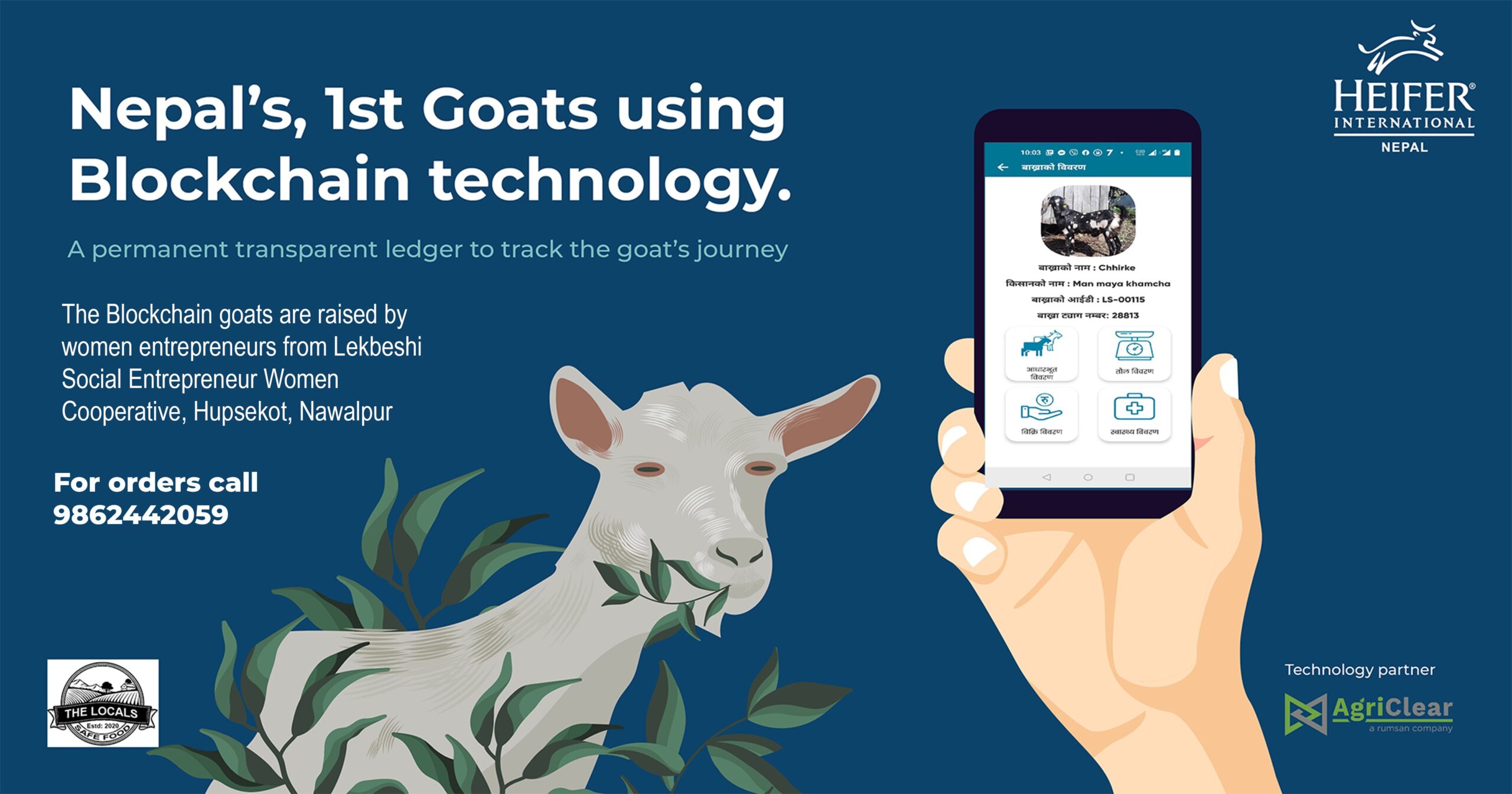 हेफर इन्टरनेसनल नेपालले एग्रीक्लियर (Agriclear by Rusman tech) संग सहकार्य गरि ब्लकचेन प्रबिधिलाई खसीबाख्राको अभिलेख राख्ने प्रबिधि निर्माण गर्न नमुना परियोजना कार्यन्वयन गरेको हो । जस अन्तर्गत लेकबेशी सामाजिक उद्यमी महिला सहकारी संस्था लि. , हुप्सेकोट – ४, नवलपुरका महिला उद्यमी हरुले हुर्काएका खसीहरु यस प्रणालीमा समावेश भएका छन् ।