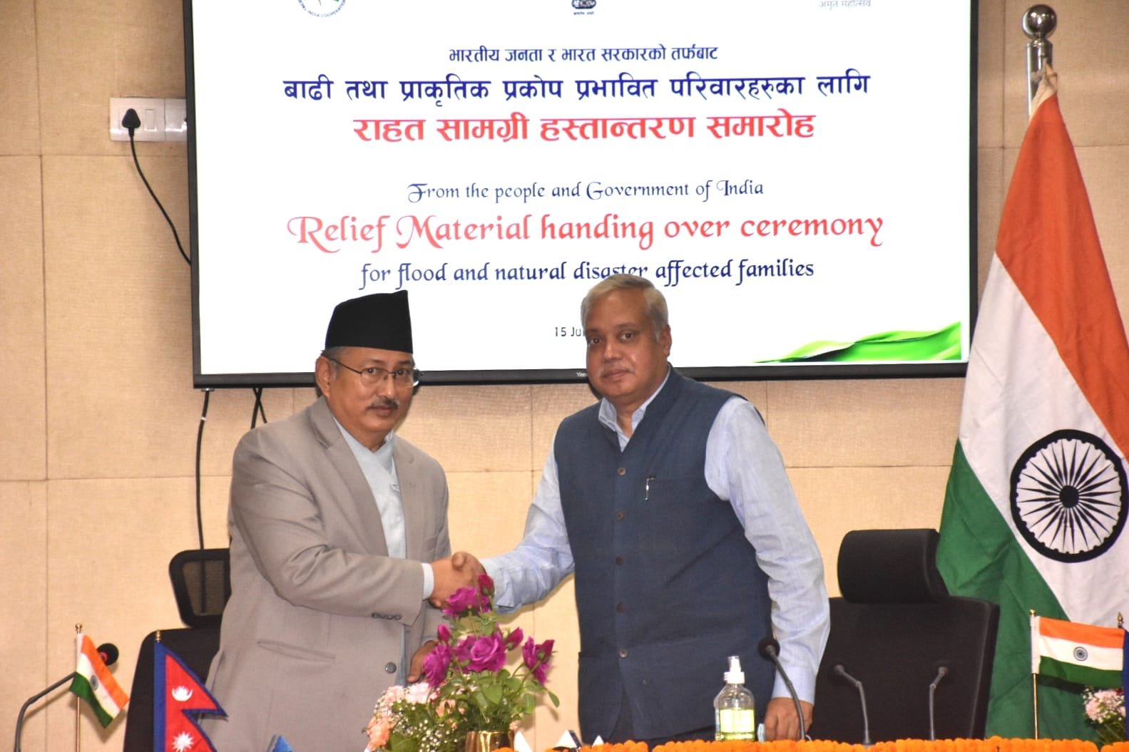 भारत सरकारको तर्फबाट नेपालका लागि भारतीय राजदूत श्री नवीन श्रीवास्तवले गृह मन्त्रालय, सिंहदरबारमा आयोजित एक समारोहबीच नेपाल सरकारका माननीय गृहमन्त्री श्री बालकृष्ण खाणलाई बाढी तथा पहिरो राहत सामग्री हस्तान्तरण गर्नुभयो । राहत सामग्रीमा ३००० वटा ठूला साइजका टेन्ट तथा १० वटा इनफ्लेटेबल डुंगा रहेका छन् ।