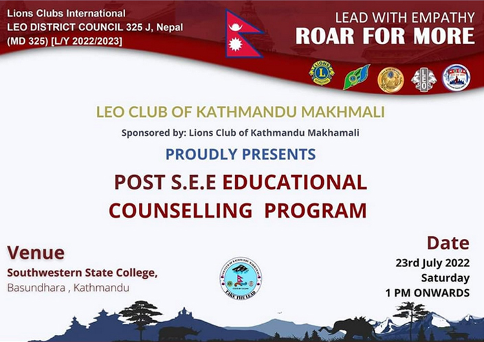 लायन्स क्लब अन्तर्राष्ट्रियको संयोजनमा रहेको लियो जिल्ला परिषद ३२५ जे नेपाल अन्तर्गतको लियो क्लब काठमान्डू मखमलीले एसइइ दिएर बसेका बिद्यार्थीहरुको लागि लक्षित गर्दै यसै साउन ७ गते साउथवेस्टर्न स्टेट कलेज , वसुन्धरा, काठमाडौँमा दिउँसो १ देखि ४ बजे सम्म एसइइ पछिको शैक्षिक परामर्श कार्यक्रम संचालन गर्ने भएको छ |