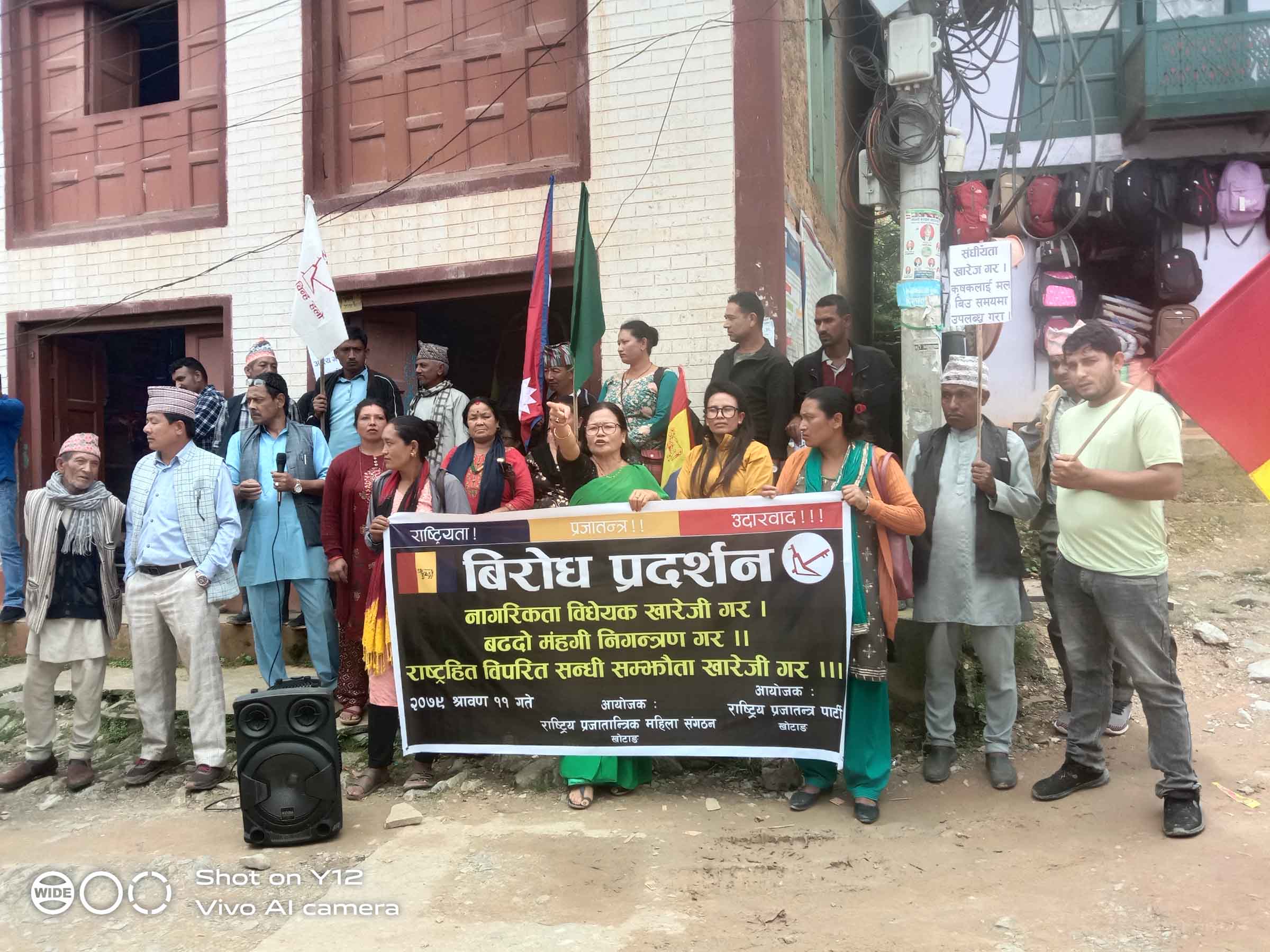 राप्रपा निकट राष्ट्रिय प्रजातान्त्रिक महिला संगठनले ‘नागरिकता विधेयक खारेजी गर, बढ्दो महँगी नियन्त्रण गर, राष्ट्रहित विपरीत सन्धि सम्झौता खारेजी गर’ लेखिएको वानरसहित जुलुस निकालेका थिए । पार्टी कार्यालयदेखि सुरु भएको जुलुस त्रिबेणीचोक पुगेर कोणसभामा पुगेर कोणसभामा परिणत भएको थियो । कोणसभालाई राप्रपाका अध्यक्ष राई, नगर कमिटी अध्यक्ष चन्द्रकुमारी राई तारा र प्रजातान्त्रिक महिला संगठनका संयोजक टिका खत्रीले सम्बोधन गरेका थिए ।