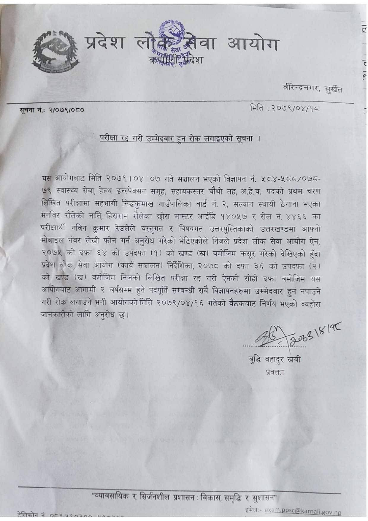 कर्णाली प्रदेश लोकसेवा आयोगले गत साउन ७ गते लिएको (अहेव पदको) चौथो तहको परीक्षामा एक जना परीक्षार्थीले उत्तर पुस्तिकामा आफ्नो मोबाइल नम्बर लेखेको भेटिएको छ ।