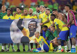Brazil’s players posed for a photograph holding a banner with the 82-year-old’s image and name after the final whistle at Stadium 974.